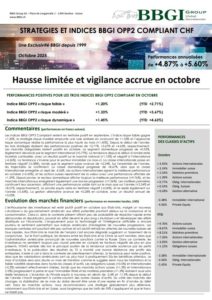 Les indices BBGI OPP2 Compliant restent en territoire positif en septembre. L’indice risque faible gagne +1.20%, la stratégie risque modéré emprunte une voie similaire en avançant de +1.33% et l’approche risque dynamique réalise la performance la plus haute du mois (+1.45%). Depuis le début de l’année, les trois stratégies réalisent des performances […]