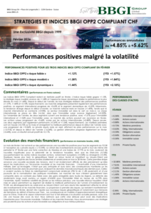 Les indices BBGI OPP2 Compliant restent en territoire positif en février. L’indice risque faible gagne +1.12%, la stratégie risque modéré avance de +1.28% et l’approche risque dynamique réalise la performance la plus élevée du mois (+1.44%). Depuis le début de l’année, les trois stratégies réalisent des performances positives (+1.57%, +1.84% et +2.10%, respectivement). Les marchés obligataires présentent également […]