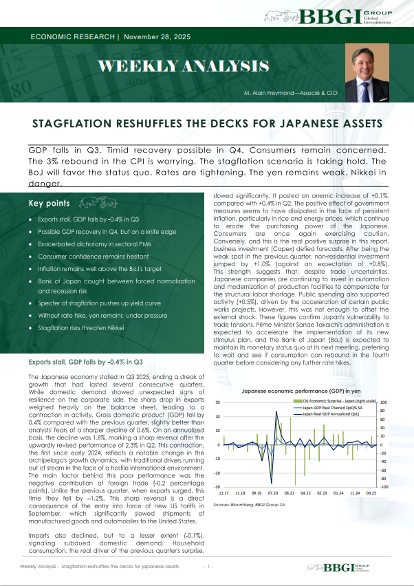 GDP falls in Q3. Timid recovery possible in Q4. Consumers remain concerned. The 3% rebound in the CPI is worrying. The stagflation scenario is taking hold. The BoJ will favor the status quo. Rates are tightening. The yen remains weak. Nikkei in danger.