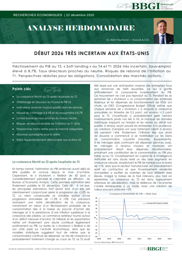Fléchissement du PIB au T3. « Soft landing » au T4 et T1 2026 très incertain. Sous-emploi élevé à 8.7%. Taux directeurs proches du neutre. Risques de rebond de l’inflation au T1. Perspectives réduites pour les obligations. Consolidation des marchés actions.