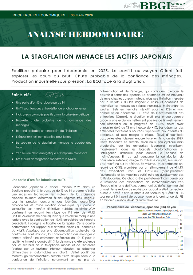 Equilibre précaire pour l’économie en 2025. Le conflit au Moyen Orient fait exploser les cours du brut. Chute probable de la confiance des ménages. Production industrielle sous pression. La BOJ face à la stagflation.