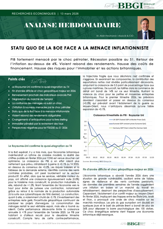 PIB fortement menacé par le choc pétrolier. Récession possible au S1. Retour de l’inflation au-dessus de 4%. Violent rebond des rendements. Hausse des coûts de financement. Hausse des risques pour l’immobilier et les actions britanniques.