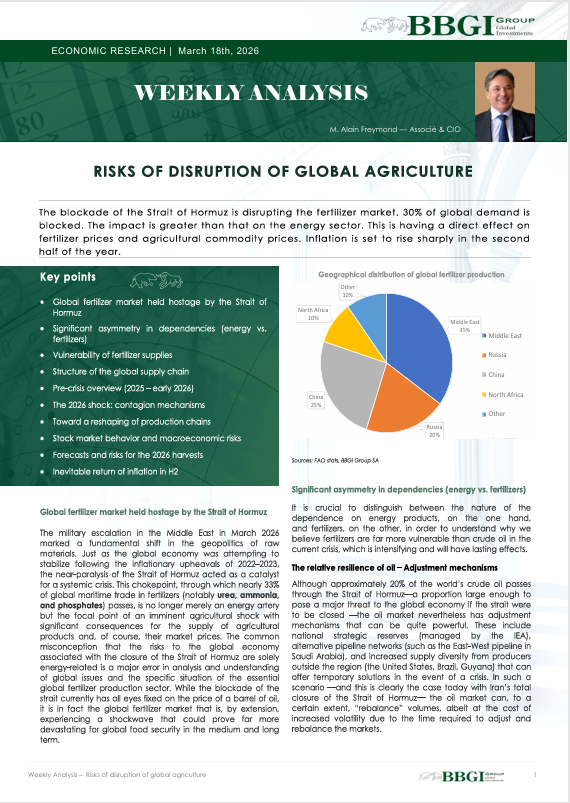 The blockade of the Strait of Hormuz is disrupting the fertilizer market. 30% of global demand is blocked. The impact is greater than that on the energy sector. This is having a direct effect on fertilizer prices and agricultural commodity prices. Inflation is set to rise sharply in the second half of the year.