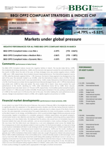 The BBGI OPP2 Compliant indices moved into negative territory in March. The low-risk index fell by -2.39%, the moderate-risk strategy declined by -2.86%, and the dynamic-risk approach posted the worst performance of the month (-3.33%). Since the start of the year, all three strategies have also posted negative returns (-0.86%, -1.08%, and -1.30%, respectively). Bond markets showed […]