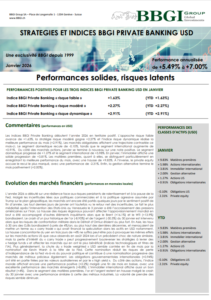 Les indices BBGI Private Banking débutent l’année 2026 en territoire positif. L’approche risque faible avance de +1.63%, la stratégie risque modéré gagne +2.27% et l’indice risque dynamique réalise la meilleure performance du mois (+2.91%). Les marchés obligataires affichent une trajectoire […]